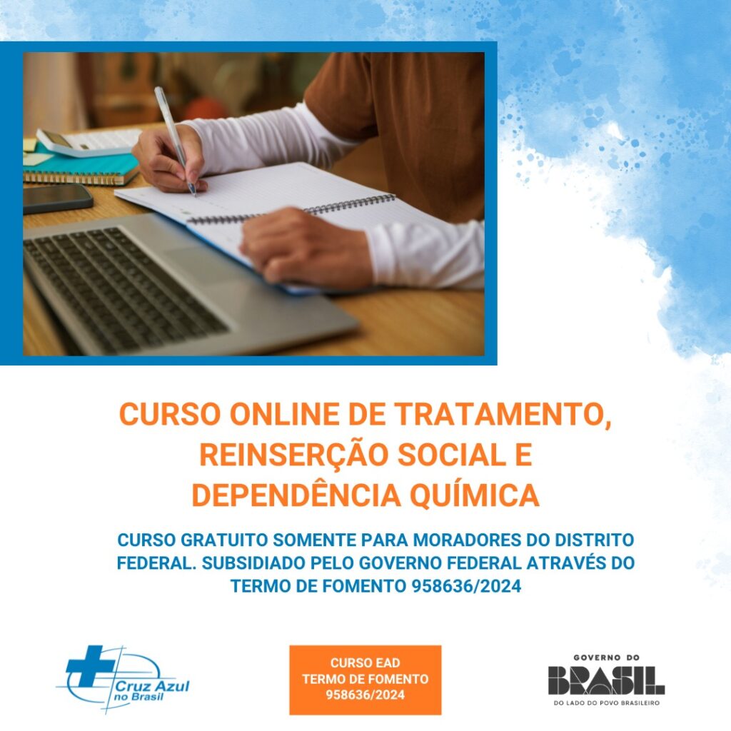 A Cruz Azul no Brasil em parceria com o Governo Federal está disponibilizando Gratuitamente para moradores do Distrito Federal o Curso Online de Tratamento, Reinserção Social e Dependência Química. Esta capacitação é subsidiada pelo governo federal através do Termo de Fomento 958636/2024.