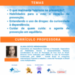 Esta Capacitação busca trazer estratégias e intervenções eficazes segundo a ONU (UNODC), trazer uma reflexão crítica sobre Saúde emocional e bem-estar como pilares da prevenção, capacitar os multiplicadores para desenvolvendo competências socioemocionais para escolhas saudáveis nas crianças e adolescentes e entender a visão das crianças e adolescentes em relação ao uso de drogas.
