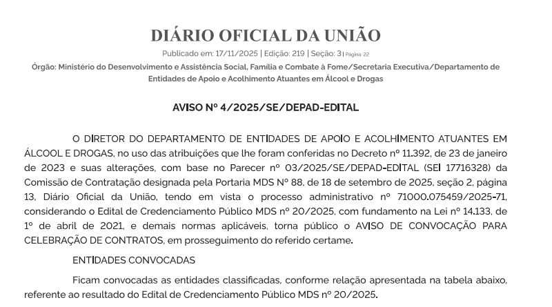 O DIRETOR DO DEPARTAMENTO DE ENTIDADES DE APOIO E ACOLHIMENTO ATUANTES EM ÁLCOOL E DROGAS, no uso das atribuições que lhe foram conferidas no Decreto nº 11.392, de 23 de janeiro de 2023 e suas alterações, com base no Parecer nº 03/2025/SE/DEPAD-EDITAL (SEI 17716328) da Comissão de Contratação designada pela Portaria MDS Nº 88, de 18 de setembro de 2025, seção 2, página 13, Diário Oficial da União, tendo em vista o processo administrativo nº 71000.075459/2025-71, considerando o Edital de Credenciamento Público MDS nº 20/2025, com fundamento na Lei nº 14.133, de 1º de abril de 2021, e demais normas aplicáveis, torna público o AVISO DE CONVOCAÇÃO PARA CELEBRAÇÃO DE CONTRATOS, em prosseguimento do referido certame.