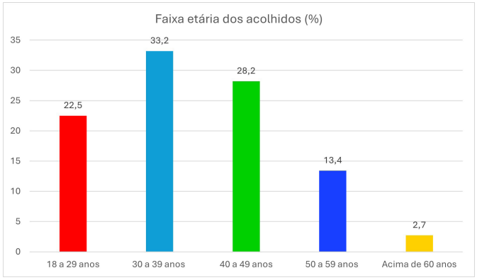 Idade: A maioria das pessoas acolhidas concentra-se na fase adulta, com mais de 61% dos casos nas faixas etárias entre 30 e 49 anos (33,2% de 30 a 39 anos e 28,2% de 40 a 49 anos). Isso sugere que o acolhimento é buscado, majoritariamente, em estágios mais avançados e crônicos da dependência.
