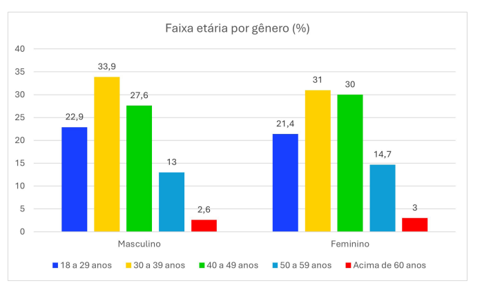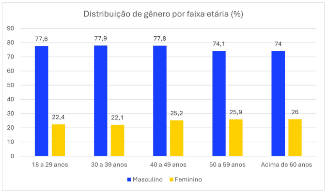 Gênero: A amostra é composta por 76,3% de homens e 23,7% de mulheres. A participação masculina se mantém estável em todas as faixas etárias, mas observa-se um leve aumento proporcional da presença feminina nas faixas acima dos 40 anos.