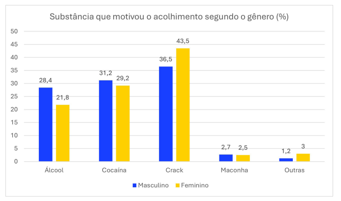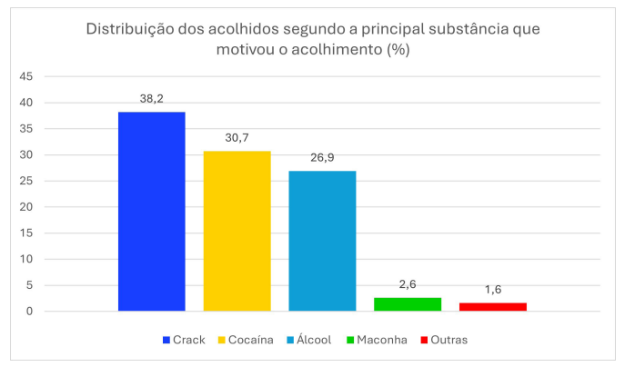 Álcool: É a terceira causa mais comum, respondendo por 26,9% dos acolhimentos. O álcool é a substância mais prevalente entre os acolhidos com 60 anos ou mais (82,2%).