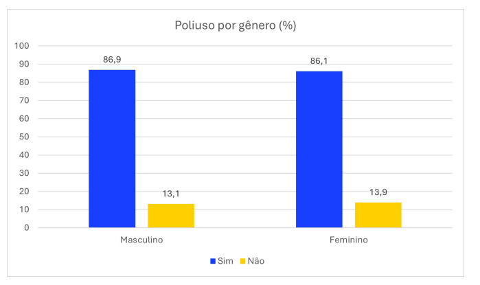 Poliuso: O uso simultâneo de múltiplas substâncias é uma realidade para a ampla maioria dos acolhidos, sendo 86,9% entre os homens e 86,1% entre as mulheres. Esse padrão complexo e de alta gravidade exige estratégias de tratamento integradas e individualizadas.