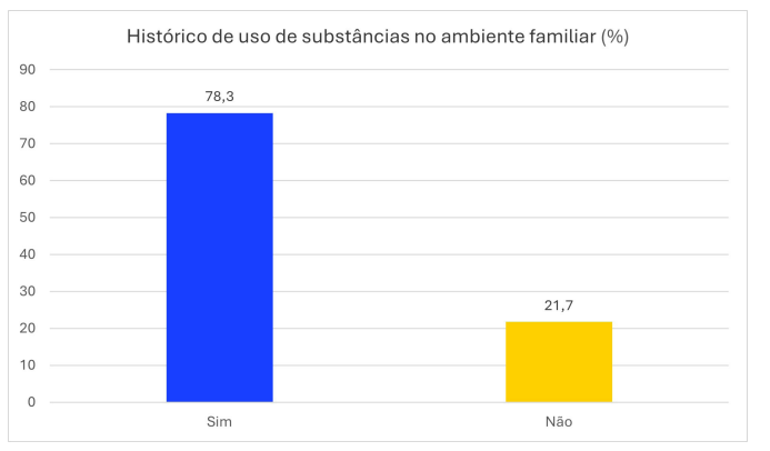 Uso Familiar: 78,3% das pessoas acolhidas relataram ter convivido com o uso de substâncias (como álcool ou tabaco) no ambiente familiar. Esse dado reforça a necessidade de ações preventivas e de apoio familiar para romper ciclos de repetição.