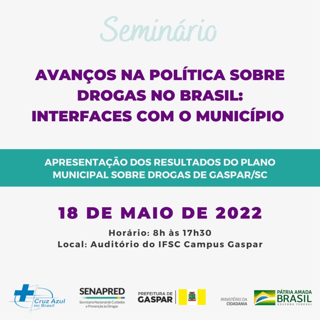 No dia 18 de maio, a cidade de Gaspar, SC, sedia o Seminário ”Avanços na Política sobre Drogas no Brasil: Interfaces com o município”. O evento será realizado no auditório do Instituto Federal de Santa Catarina (IFSC) das 8h às 17h.